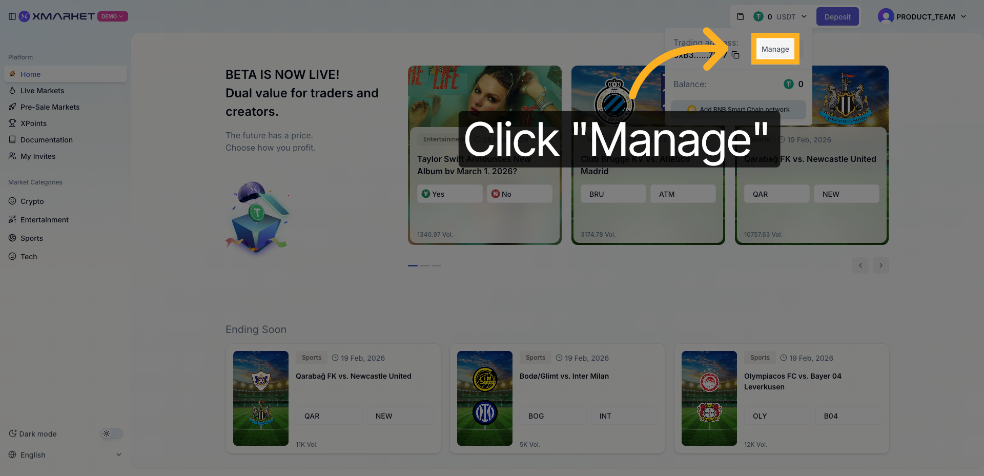 - 상단 내비게이션 바에서 USDT 잔액의 Manage를 클릭합니다.