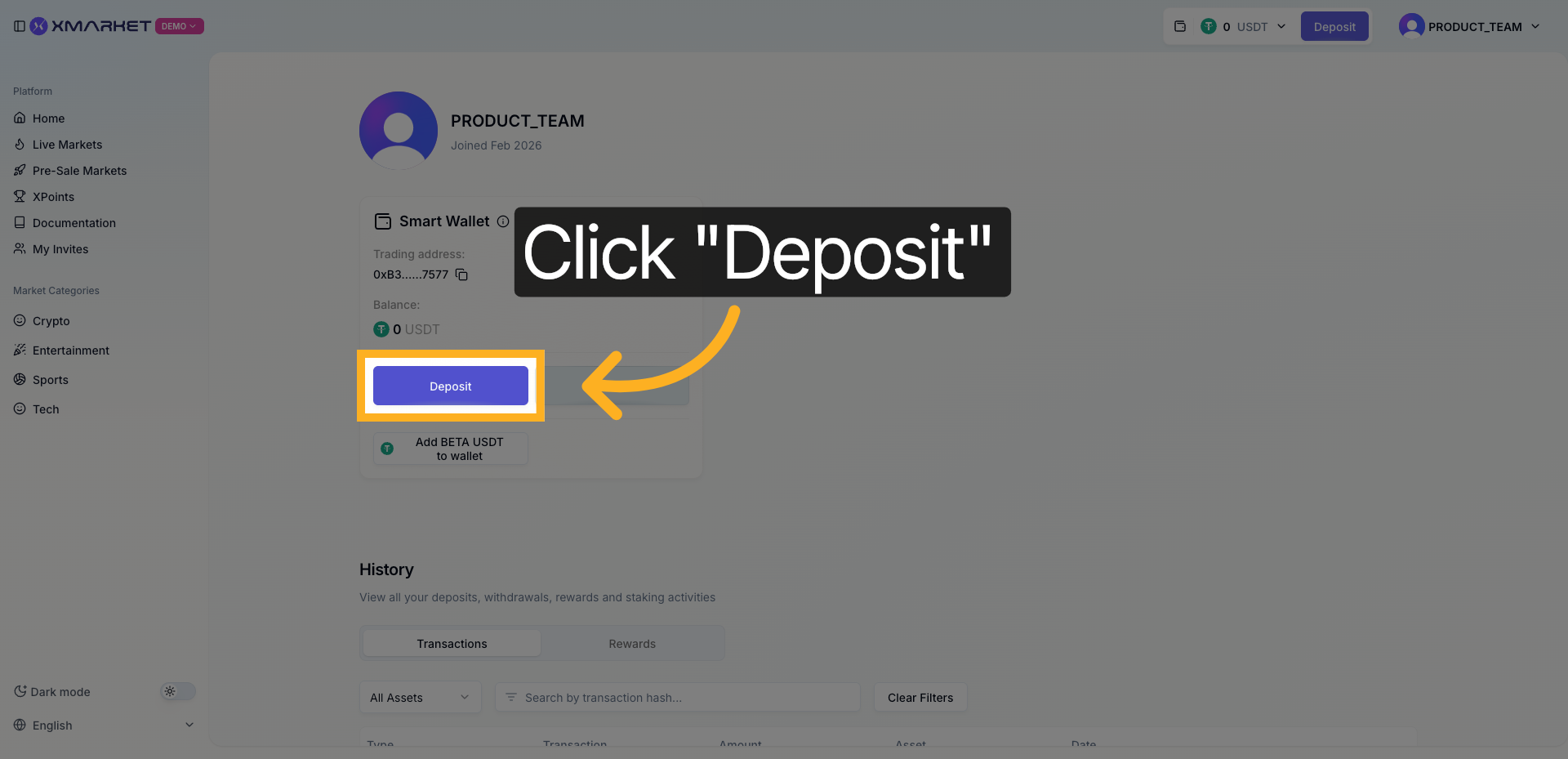 Xmarket은 USDT를 주요 거래 토큰으로 사용합니다.