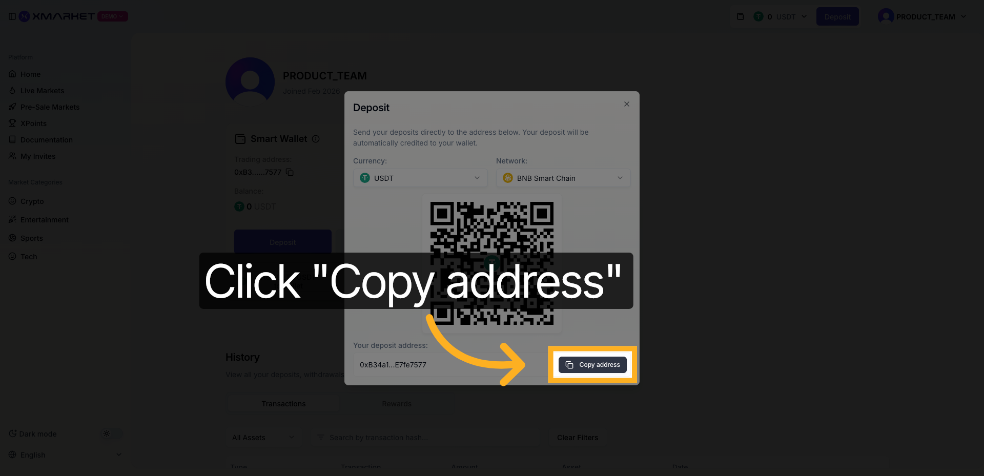 - 입금 주소를 복사하거나 QR 코드를 스캔합니다.