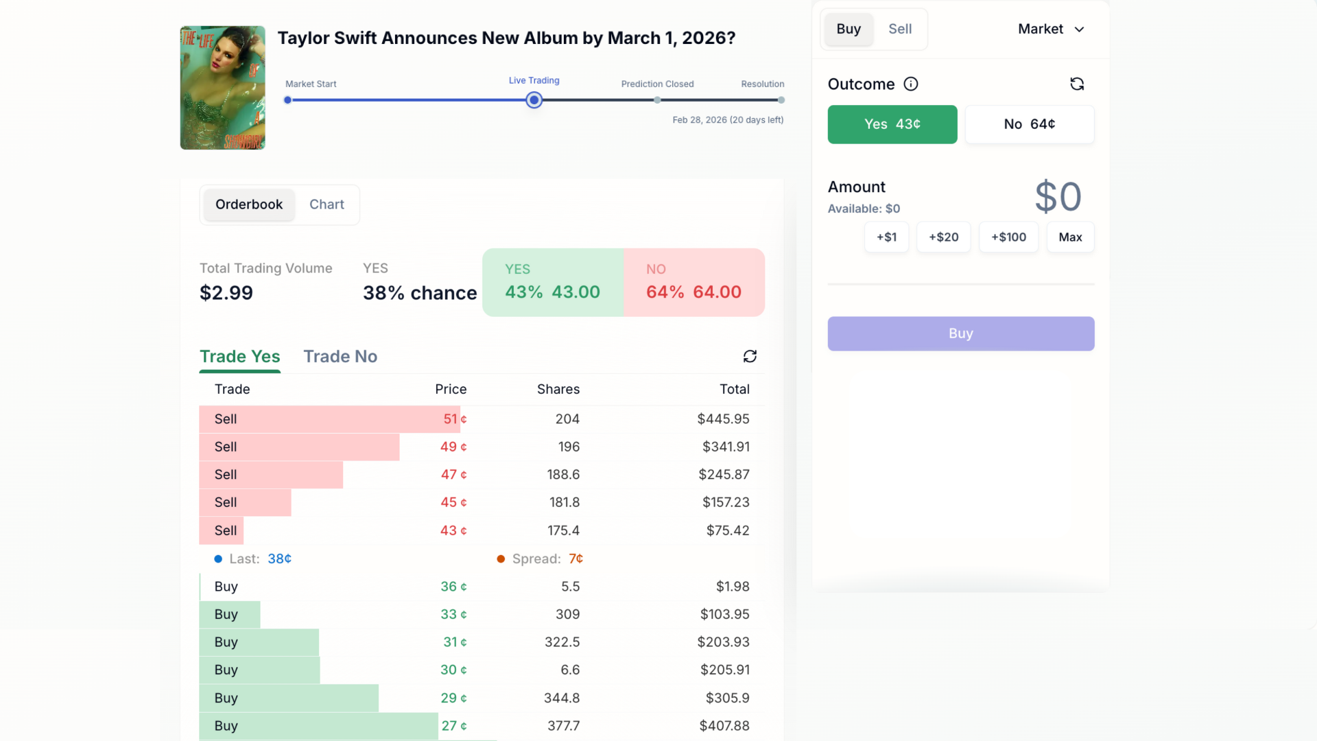 아래 마켓에서 표시된 확률은 현재 마켓 가격을 기반으로 38%입니다. 최고 매수 가격은 36¢이고 최저 매도 가격은 43¢로, 7¢의 매수-매도 스프레드가 형성되어 있습니다.