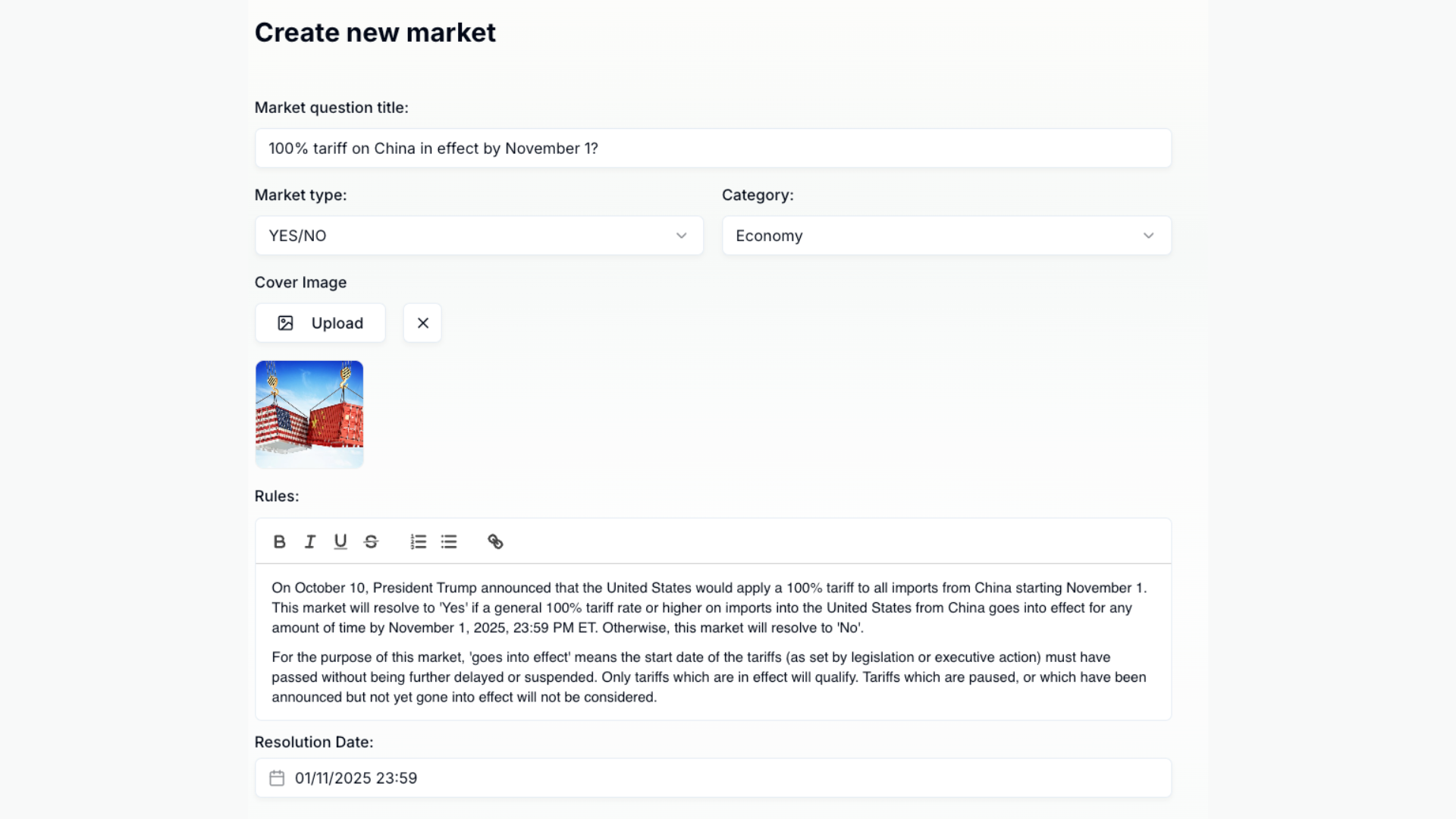 예시 - "11월 1일까지 중국에 대한 100% 관세가 발효될 것인가?":