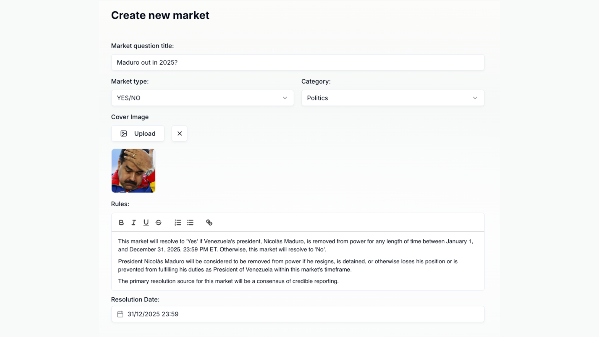 "이 마켓은 베네수엘라 대통령 니콜라스 마두로가 2025년 1월 1일부터 12월 31일 23:59 PM ET 사이에 어떤 기간이든 권력에서 제거되면 **"Yes"**로 정산됩니다. 그렇지 않으면 **"No"**로 정산됩니다.