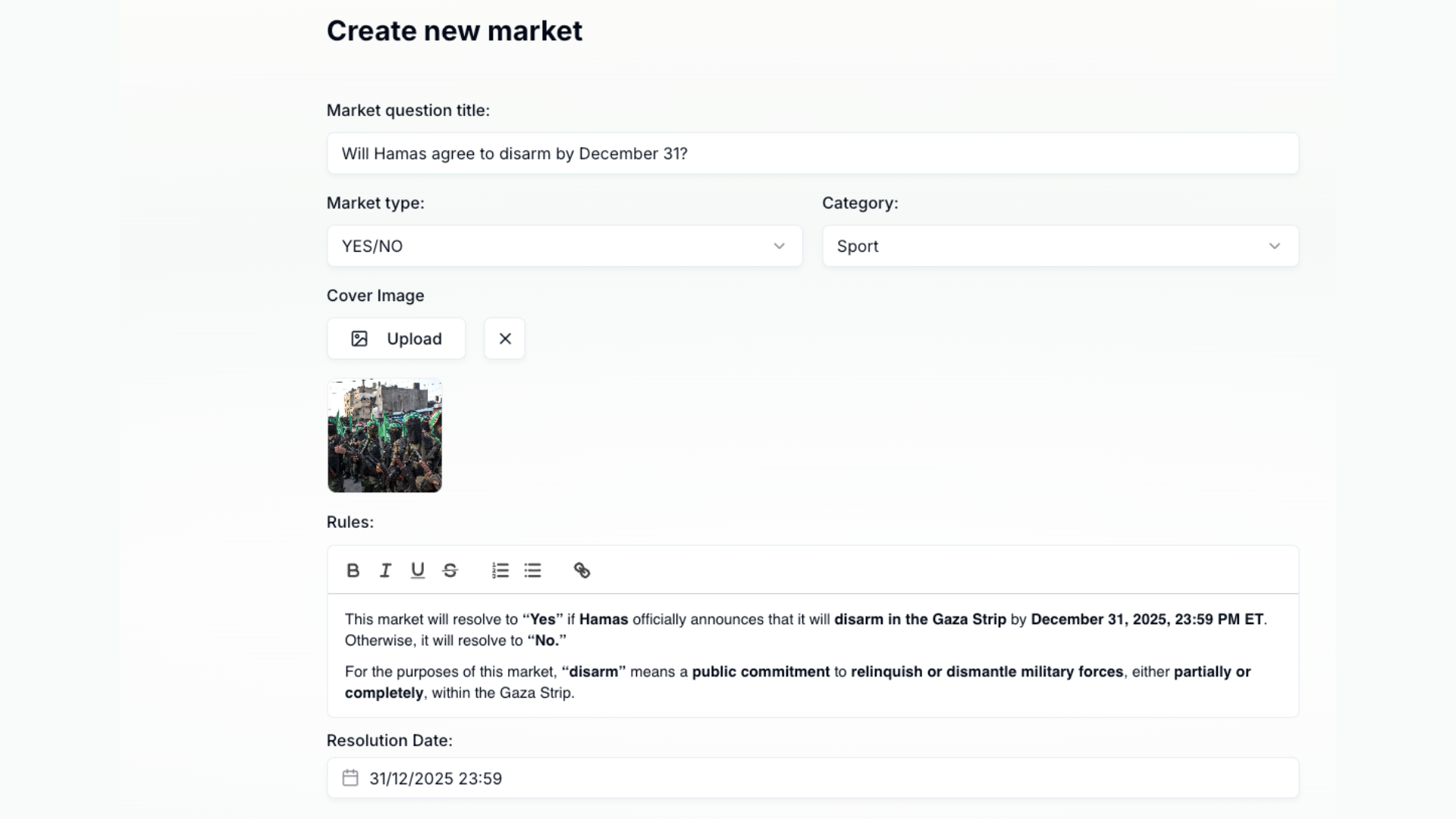 "이 마켓의 목적상, '무장 해제'란 가자 지구에서 부분적이든 전체적이든 군사력을 포기하거나 해체하겠다는 공개적인 약속을 의미합니다. 부분적 무장 해제 발표(예: 특정 무기 종류를 항복하거나 단계적으로 또는 특정 지역에서 무장 해제에 동의)는 인정된 무장 해제 과정의 일부인 한 인정됩니다.