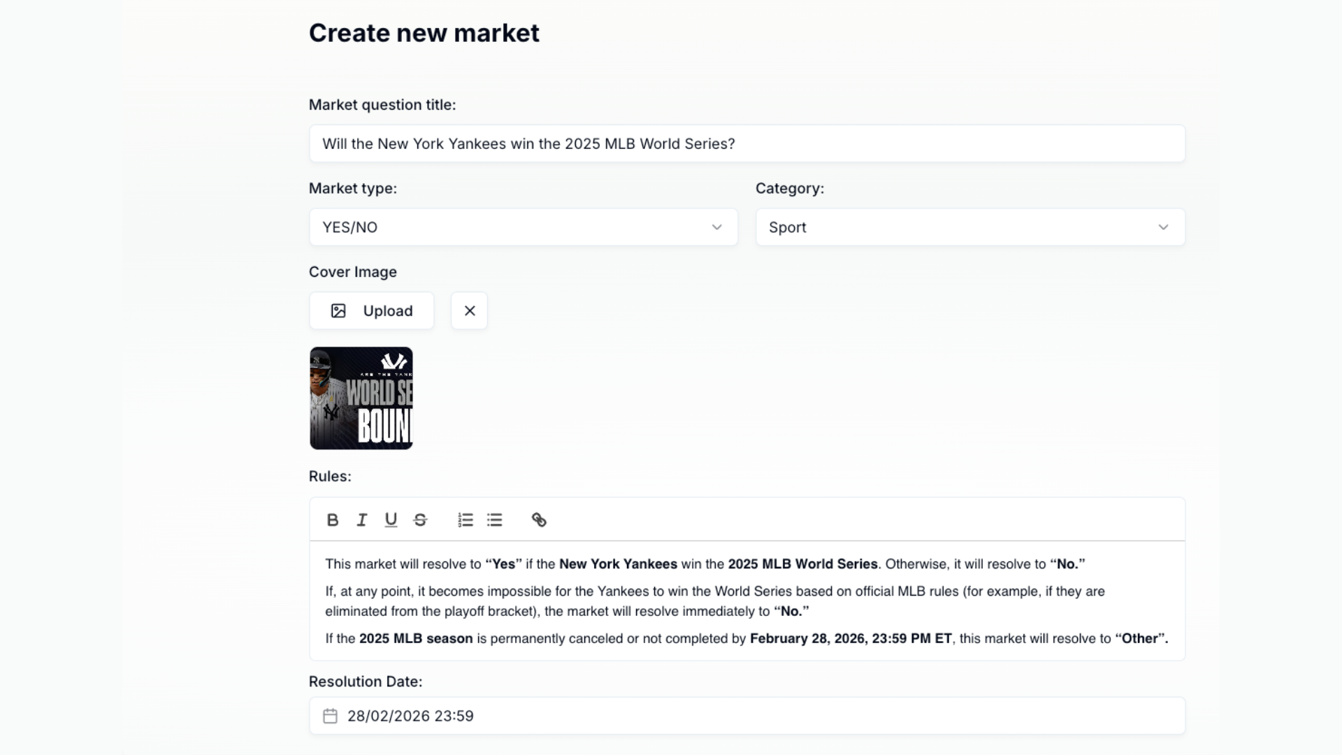 공식 MLB 규칙에 따라 양키스가 월드 시리즈에서 우승하는 것이 불가능해지는 시점(예: 플레이오프 대진에서 탈락)에서 마켓은 즉시 **"No"**로 정산됩니다.