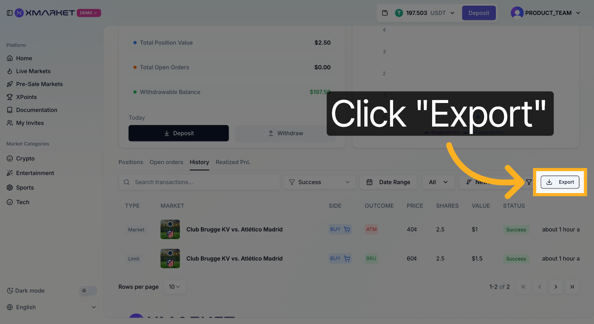 마켓 예측 내역을 관리할 수 있도록, Xmarket 거래 내역의 월별 거래 보고서를 생성할 수 있습니다. 아래 단계에 따라 Xmarket에서 거래 내역을 다운로드하세요: