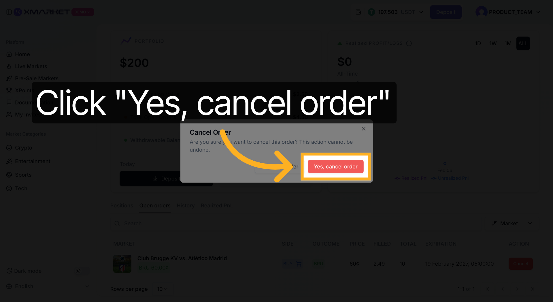 여러 마켓에 주문이 있는 경우 Portfolio 페이지에서도 취소할 수 있습니다.